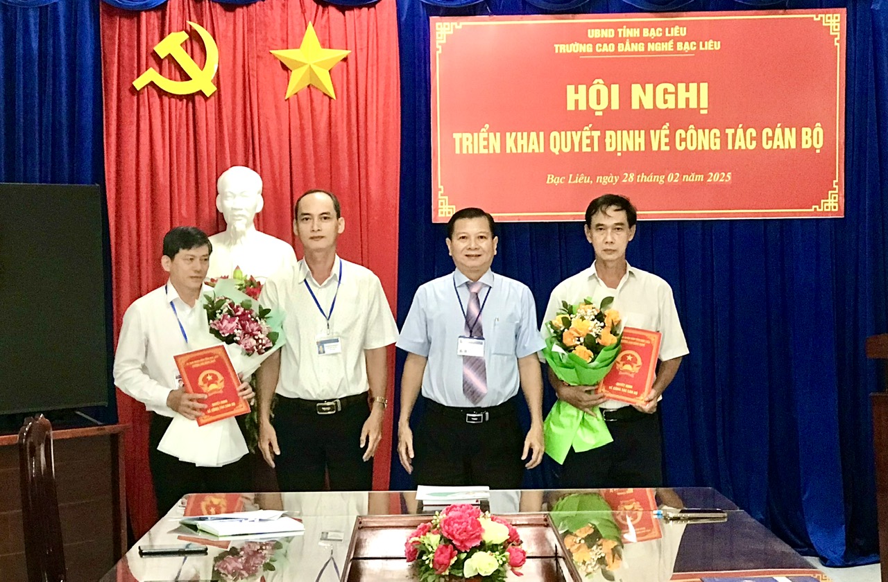 Ngày 28/02, tại Trường Cao đẳng nghề Bạc Liêu đã diễn ra hội nghị Công bố Quyết định bổ nhiệm Cán bộ lãnh đạo, quản lý. Tham dự Hội nghị có ông Nguyễn Thanh Sang - Bí thư Đảng ủy, Hiệu trưởng, ông Huỳnh Thanh Hùng - Phó Bí thư Đảng ủy, Phó Hiệu trưởng cùng quý thầy cô là lãnh đạo phòng, khoa, trung tâm; tập thể giảng viên, chuyên viên, của 2 đơn vị: Khoa Cơ khí và phòng Khảo thí & Đảm bảo chất lượng Đào tạo Trường Cao đẳng nghề Bạc Liêu .