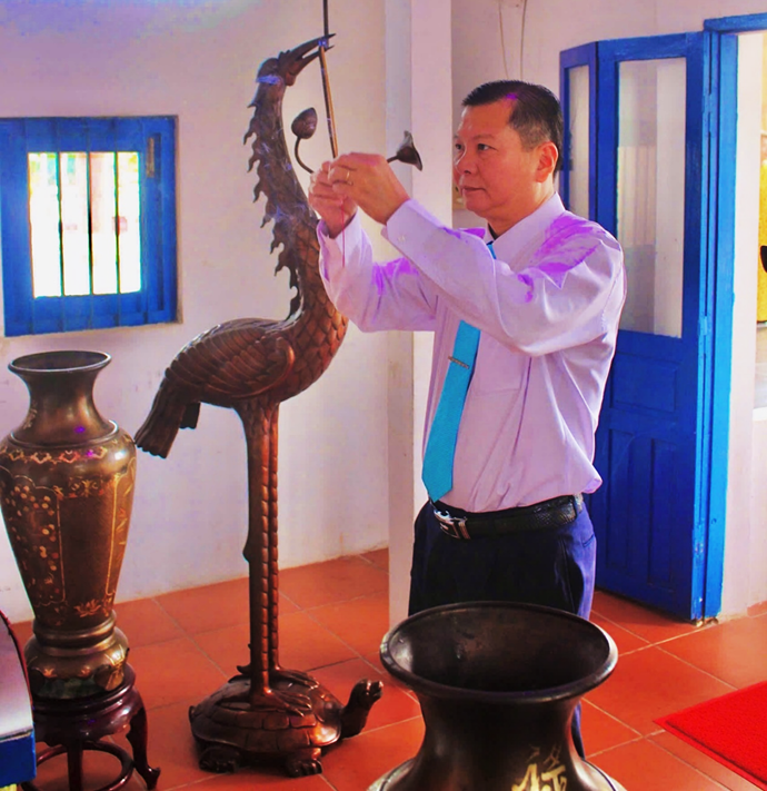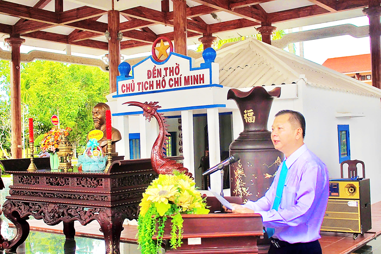 Đồng chí Nguyễn Thanh Sang - Bí thư đảng ủy, Hiệu trưởng nhà trường báo công kính dâng Bác thành tích của đảng bộ trường