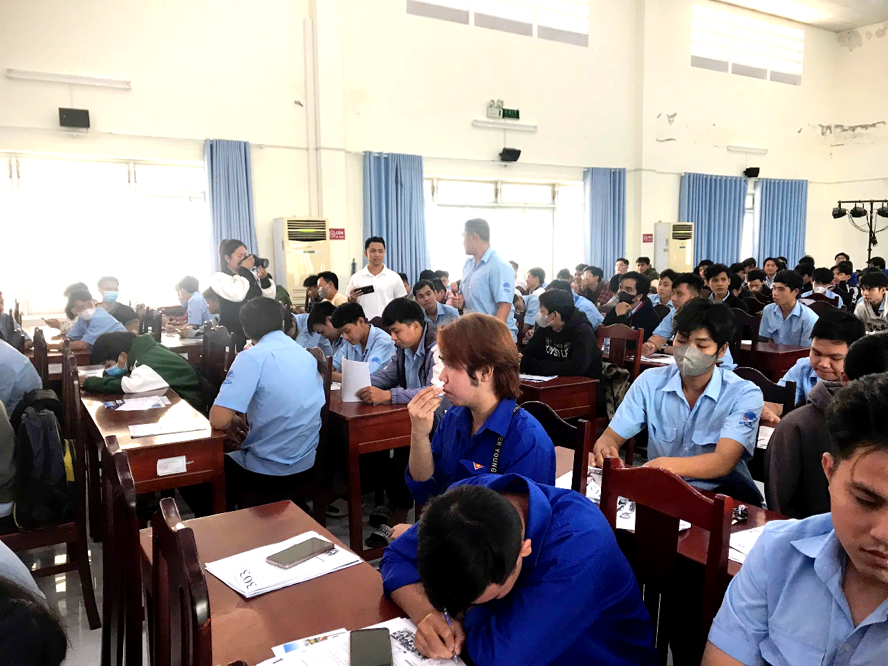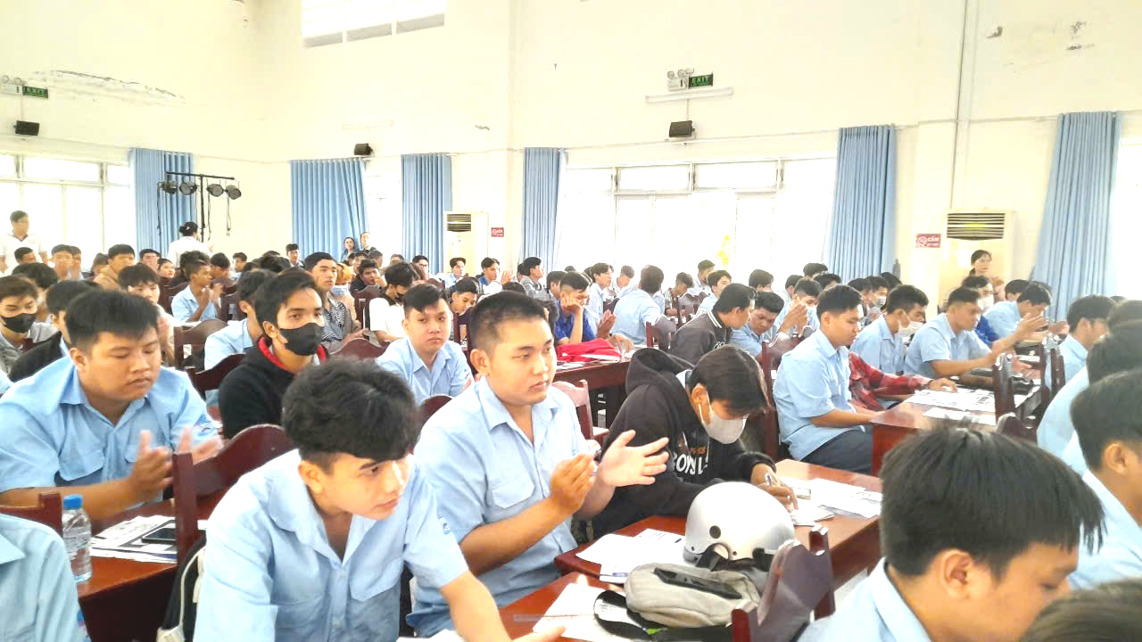 Hình ảnh ghi lại học sinh sinh viên của trường đang chú ý lắng nghe các nhà tuyển dụng tư vấn trong Ngày hội việc làm