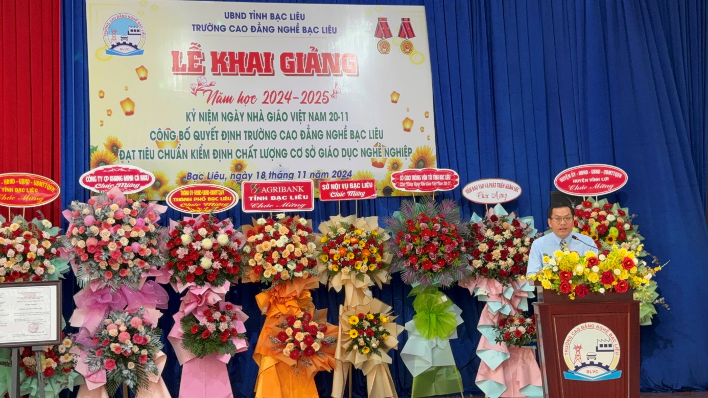 Chiều 18/11, Trường Cao đẳng Nghề Bạc Liêu long trọng tổ chức khai giảng năm học 2024-2025; kỷ niệm 42 năm Ngày Nhà giáo Việt Nam (20/11/1982-20/11/2024); công bố quyết định và trao chứng nhận đạt tiêu chuẩn kiểm định chất lượng cơ sở giáo dục nghề nghiệp cho Trường Cao đẳng Nghề Bạc Liêu. Đến dự buổi lễ có các đồng chí Tạ Trung Dũng-UV BTV Tỉnh ủy, Trưởng Ban Tuyên giáo Tỉnh ủy; Bùi Tấn Bảy-Tỉnh ủy viên, Phó Chủ tịch Thường trực HĐND tỉnh; Ngô Vũ Thăng-Tỉnh ủy viên, Phó Chủ tịch UBND tỉnh...; đại diện lãnh đạo các sở, ban, ngành trong tỉnh; các trường đại học, cao đẳng và các doanh nghiệp trong và ngoài tỉnh cùng tập thể viên chức và 300 học sinh sinh viên đại diện cho hơn 1400 học sinh sinh viên của nhà trường.