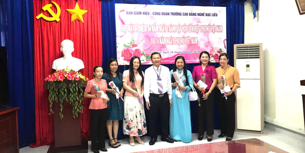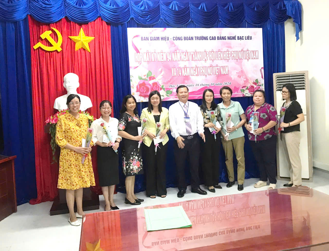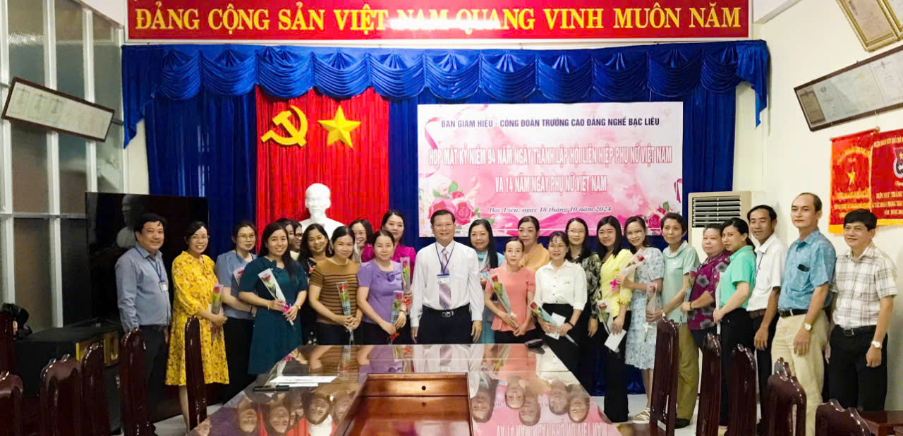 Nhân kỷ niệm 94 năm ngày thành lập Hội liên hiệp phụ nữ Việt Nam (20/10/1930 - 20/10/2024) và 14 năm ngày Phụ nữ Việt Nam (20/10/2010 -20/10/2024), chiều ngày 18/10/2024 tại phòng họp Trường Cao đẳng nghề Bạc Liêu đã tổ chức buổi họp mặt giữa Hiệu trưởng, BCH Công đoàn trường và toàn thể viên chức nữ đang làm việc tại Trường Cao đẳng nghề Bạc Liêu nhằm ôn lại truyền thống của ngày lễ đặc biệt này và tôn vinh nữ viên chức trong toàn đơn vị.