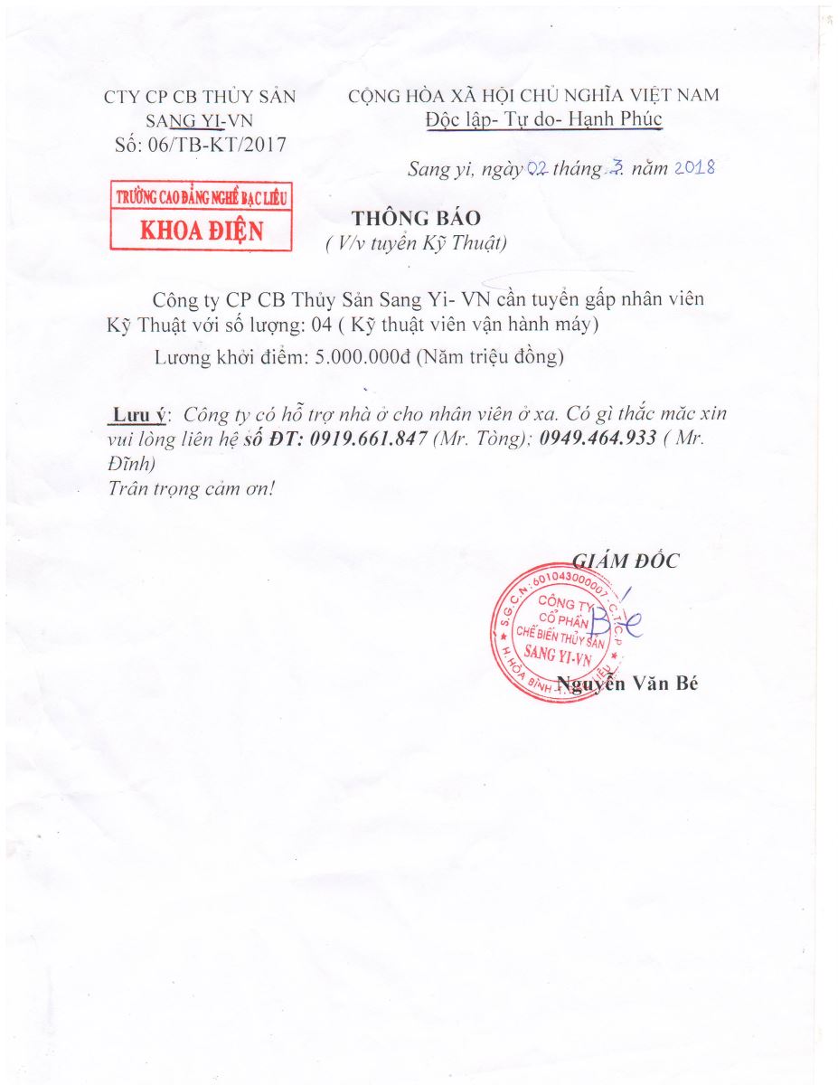Trường Cao đẳng nghề Bạc Liêu liên kết với Công ty Cổ phần Cơ điện công trình Liên Thành Phú Quốc tuyển dụng học viên sau khi tốt nghiệp ra trường
