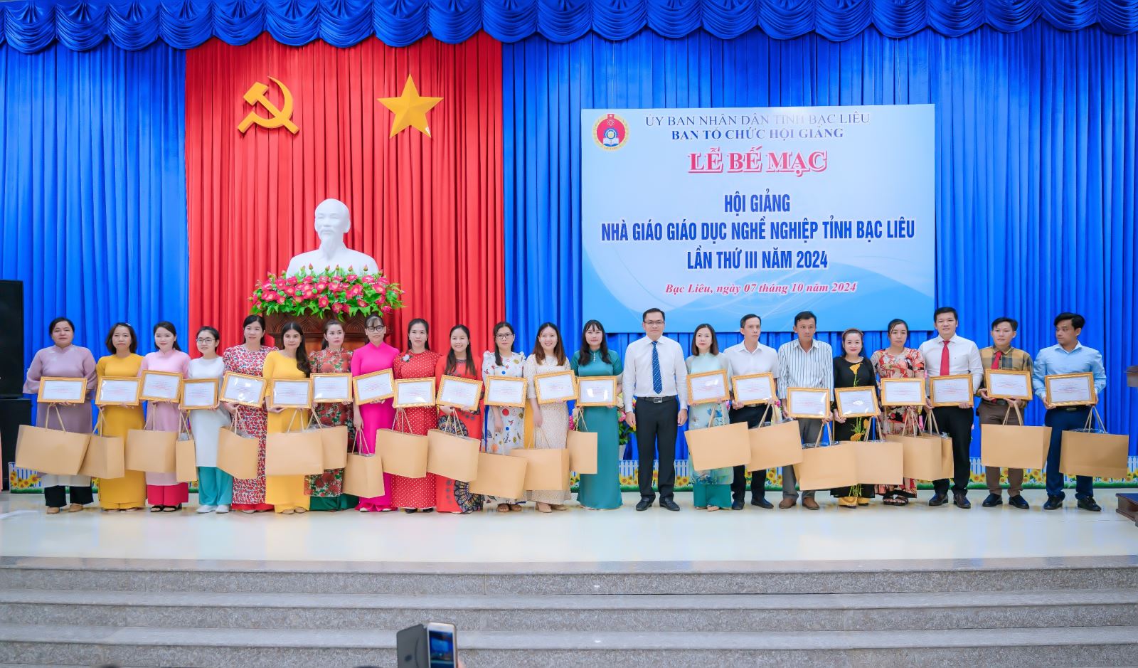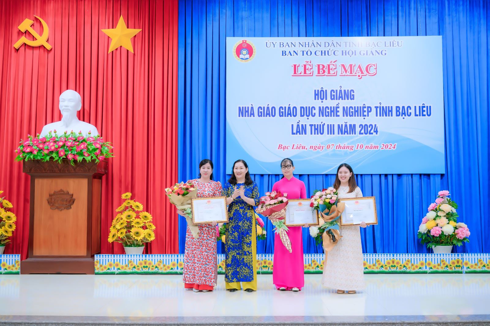 Tại lễ bế mạc Hội giảng, Trường Cao đẳng Nghề Bạc Liêu đã được Ban tổ chức trao giải Ba cho tập thể Nhà trường, 03 cá nhân có thành tích cao trong Hội giảng gồm: Cô Trần Thị Thắm, đạt Giải Nhất; Thầy Nguyễn Ngọc Châu và Cô Lê Thị Hoàng Oanh đạt giải Khuyến khích. Hội giảng nhà giáo giáo dục nghề nghiệp tỉnh Bạc Liêu lần thứ III năm 2024 đã đạt được các mục tiêu đề ra, trong đó Cô Trần Thị Thắm đại diện Trường Cao đẳng Nghề Bạc Liêu tham dự Hội giảng nhà giáo dục nghề nghiệp toàn quốc trong thời gian tới.